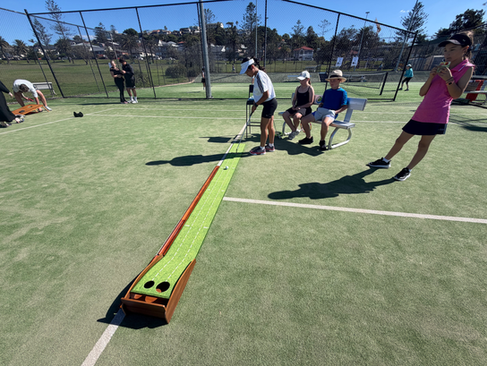 With the formal start to the day complete, the emphasis then shifted to fun and enjoyment. Five of our six courts were dedicated to social tennis throughout the afternoon, while Court 6 became ‘the Fun Court’, featuring activities including POP Tennis, Golf Putting and Cornhole. Table Tennis was also in full swing inside the clubhouse.
